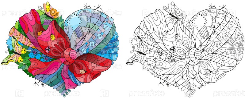 Векторная раскраска для взрослых текстурирует сердце, перевязанное лентой и бантом. Художественный дизайн ручной росписи. Антистрессовая раскраска для взрослых. Черно-белая ручная иллюстрация сердца для раскраски