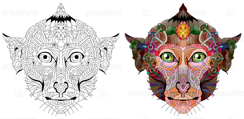 Zentangle голова обезьяны с мандалой. Ручно нарисованная декоративная векторная иллюстрация. Набор цветов и контуров