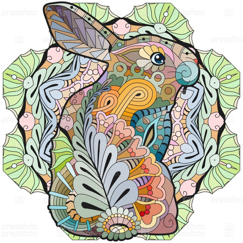 Весенний кролик на мандале для украшения. Красочная векторная иллюстрация