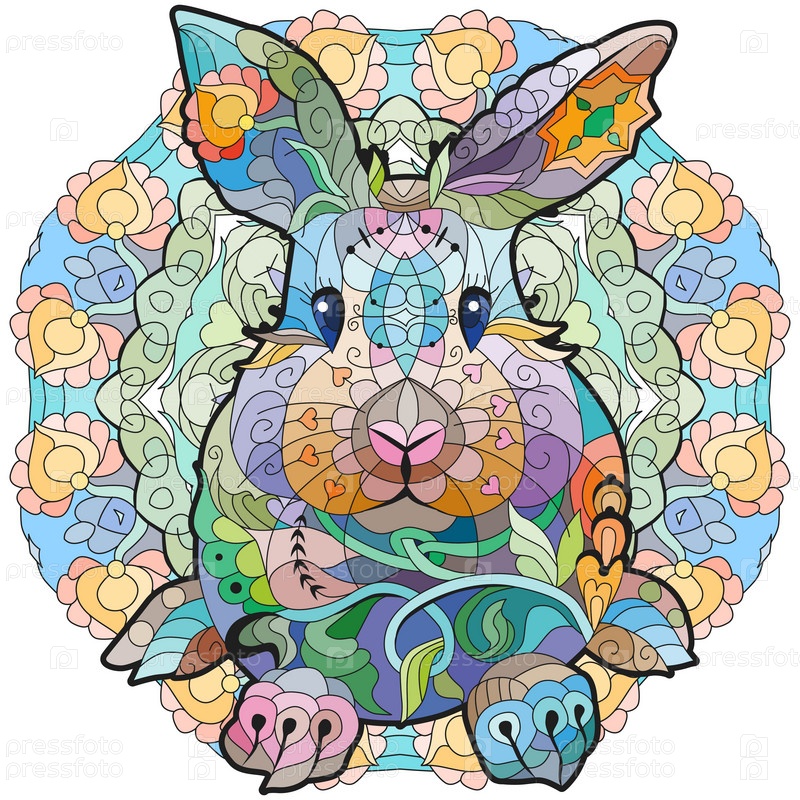 Весенний кролик на мандале. Пасхальный фон с творческим милым кроликом. Красочная векторная иллюстрация