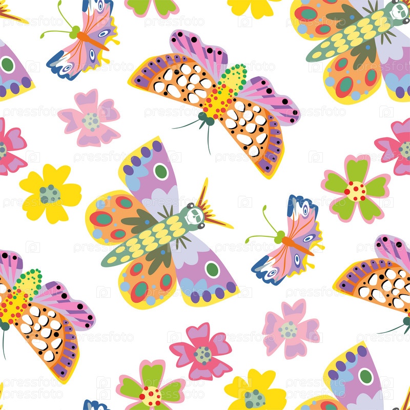 Бесшовный узор с бабочкой на белом фоне. Векторная иллюстрация. Печать на ткани, бумаге, обоях, дизайн упаковки