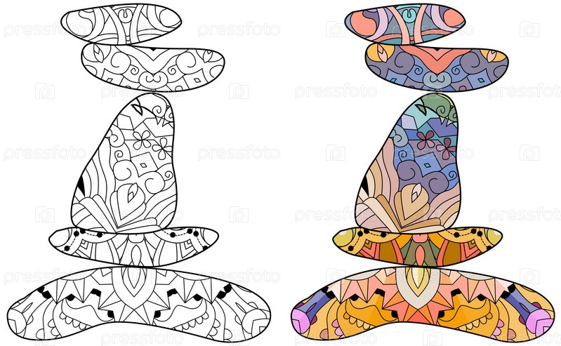 Концепция баланса. Дзен камни плоский стиль дизайна для раскраски страниц. Набор цветов и контуров
