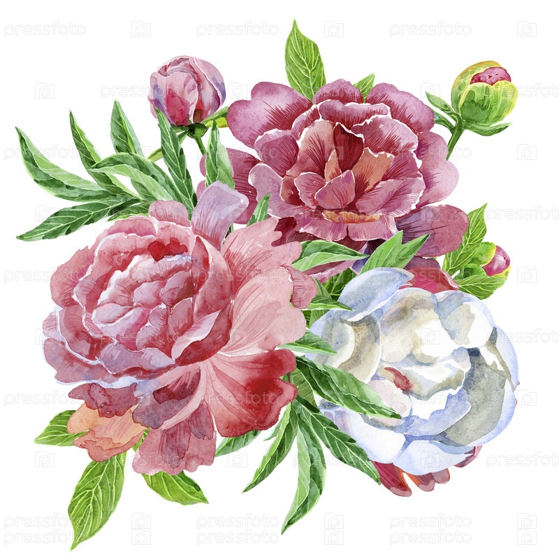 Акварельный букет пионов. Винтажные цветочные элементы с пионскими цветами и листьями на белом фоне. Нарисованный от руки