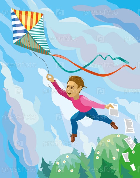 Человек парит высоко над землей с воздушным змеем
