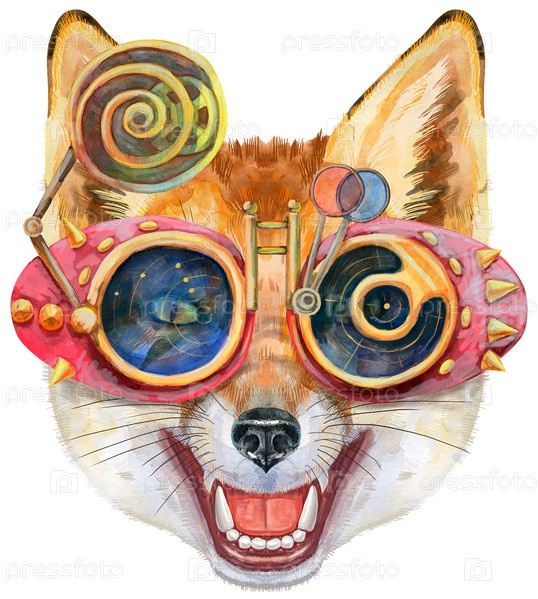 Портрет лисы в очках. Иллюстрация акварели оранжевой лисы. Прекрасный мир дикой природы