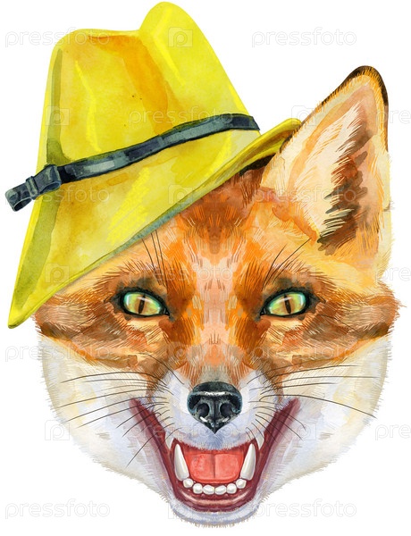 Портрет лисы в желтой шляпе. Иллюстрация акварели оранжевой лисы. Прекрасный мир дикой природы