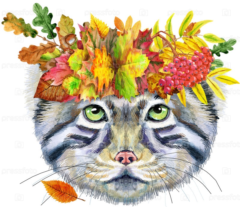 Акварельный рисунок животного - кошачий манул в осеннем венке, эскиз