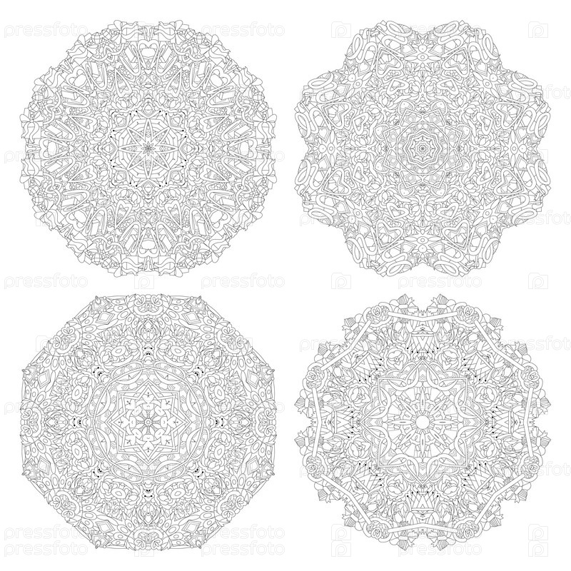 Векторные текстуры книги раскраски для взрослых. Художественный дизайн ручной росписи. Антистрессовая раскраска для взрослых. Черно-белый набор иллюстраций из 4 мандал для раскраски