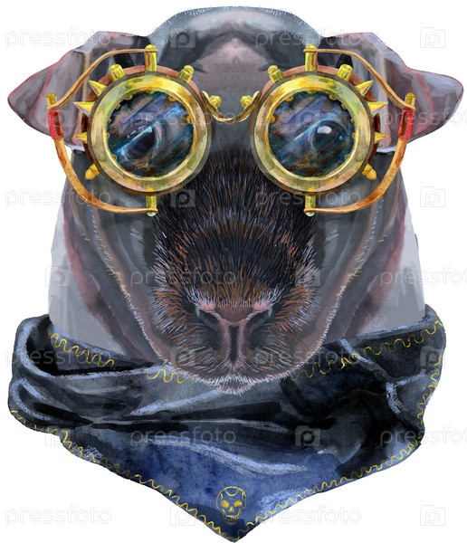Акварельный портрет тощей морской свинки в стимпанк-очках на белом фоне
