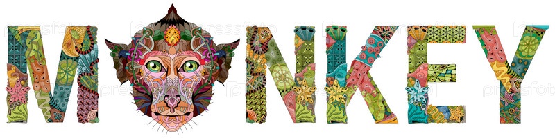 Слово обезьяны с головой животного. векторный объект zentangle для украшения