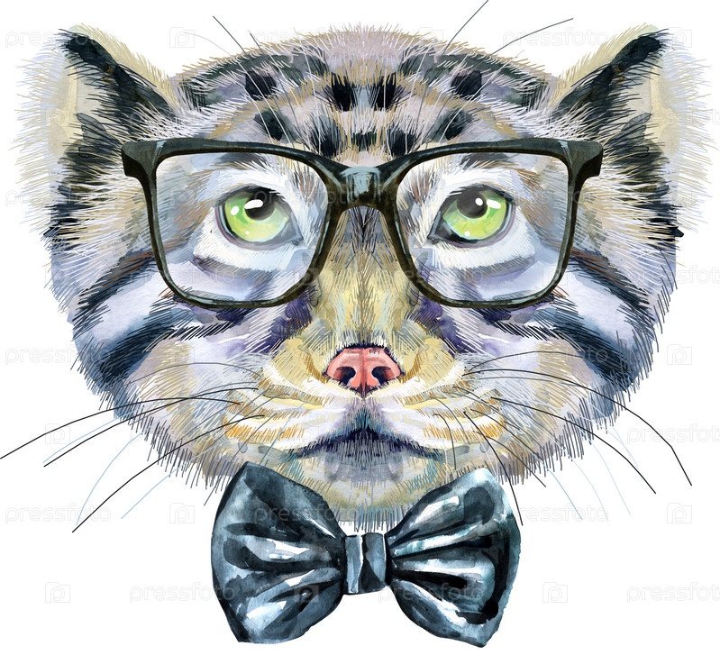 Акварельный портрет кота Манула в больших черных очках на белом фоне