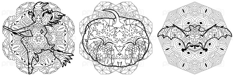 Ведьма, летучая мышь и тыквенка декоративные с узором. векторный объект zentangle для Хэллоуина. Для покраски