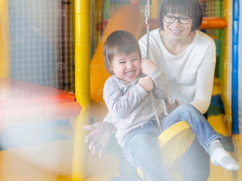 Малыш играет на качелях со своей мамой или няней. Физическое развитие маленьких детей. Интерьер детского сада или детской