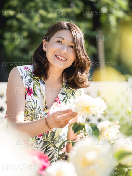 Кавказская женщина любуется цветущими розами в общественном парке. Летние вибрации. Тропические растения и цветы цветут в саду