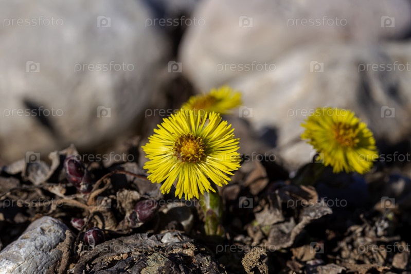Лекарственное растение-мать и мачеха (Tussilago) с желтыми цветами растет крупным планом