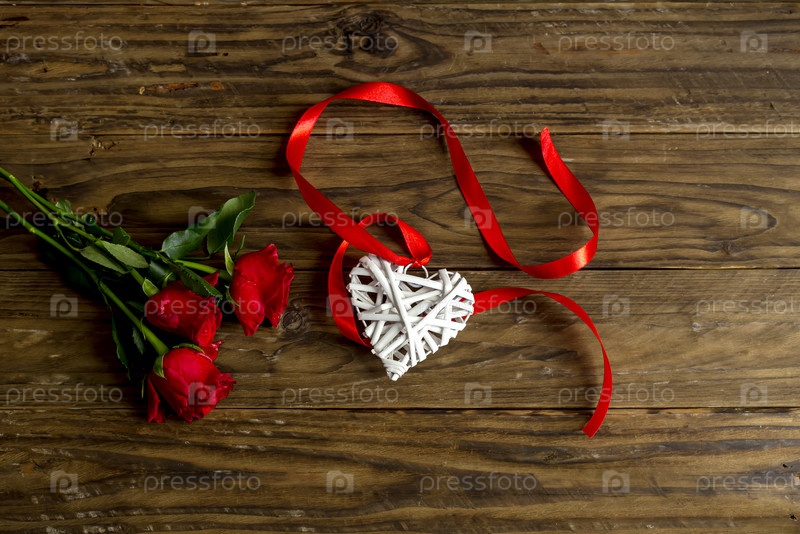 Праздничные красные розы и сердце на деревянном столе