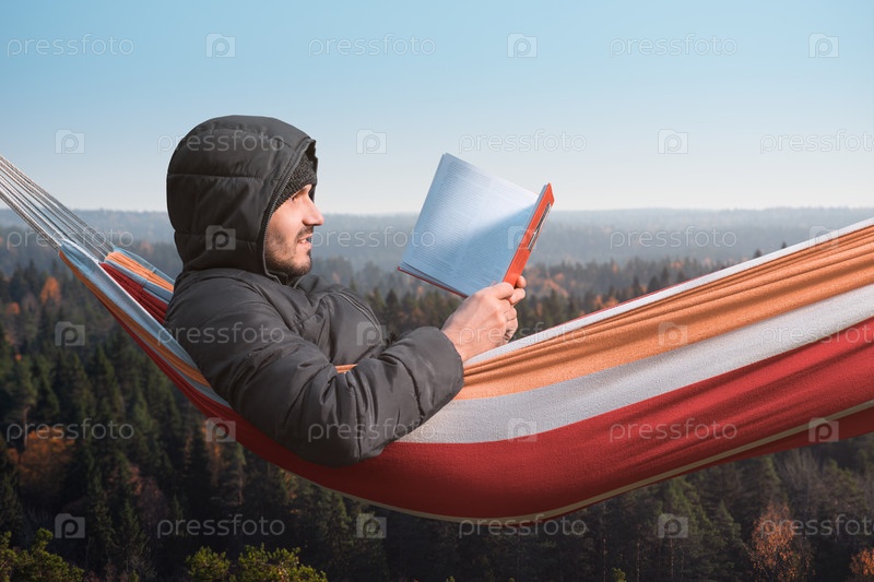 Мужчина сидит в гамаке и читает книгу в живописном месте