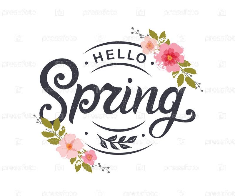 Дизайн вектора типографии Hello Spring для поздравительных открыток и плакатов. Текст рукописного надписи выделен на розовом фоне. Празднование шаблона дизайна. Векторная иллюстрация