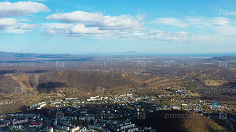 Вид с воздуха на панораму городского пейзажа. Петропавловск-Камчатский, Россия