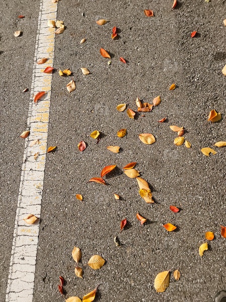 Фон опавших желтых и красных листьев с белой линией на асфальте в городе
