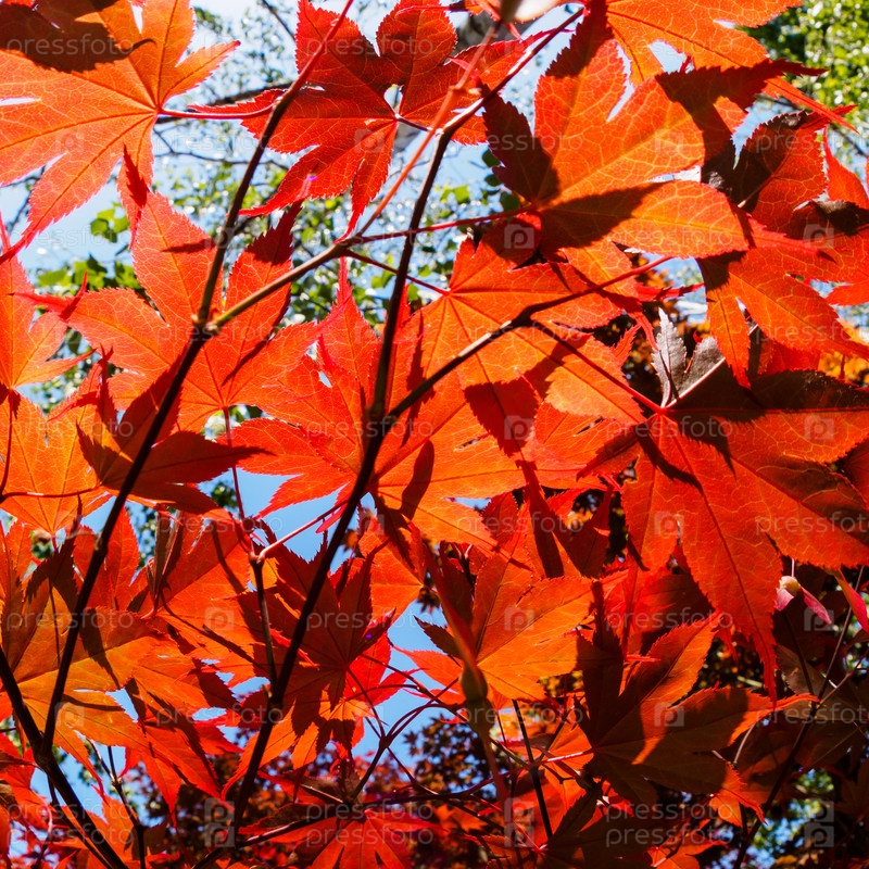 Японский клен осенью. Красные листья клена светятся в лучах солнца. Вид снизу