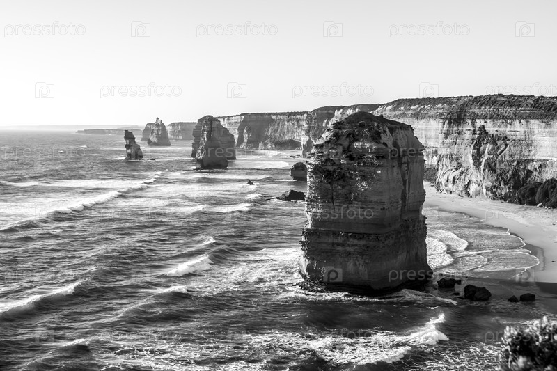 Морские скалы двенадцати апостолов возле Великой океанской дороги, национальный парк Порт-Кэмпбелл, Австралия. Черно-белое изображение