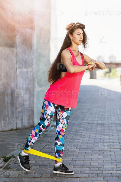 Молодая женщина выполняет упражнения с фитнес-резинками на набережной теплым солнечным утром. Концепция здорового образа жизни