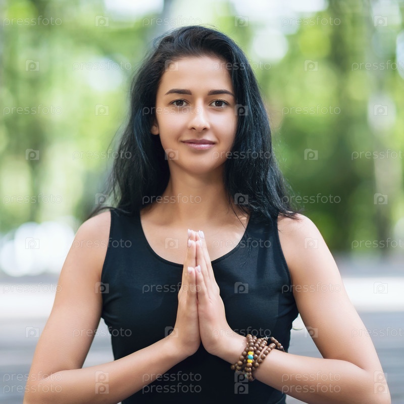 Портрет молодой красивой женщины, практикующей йогу, выполняющей приветствие намасте в парке, инструктор смотрит в камеру