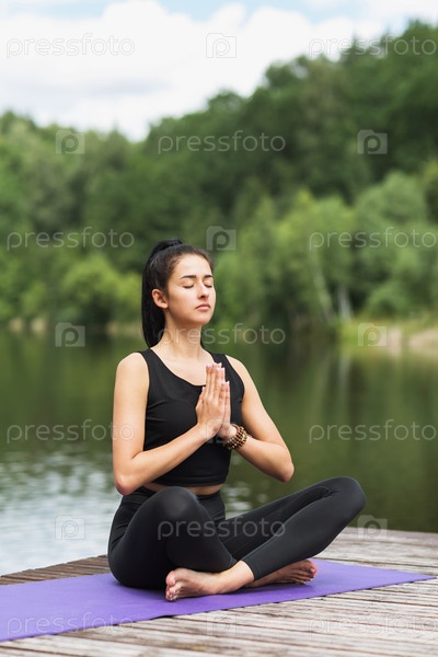 Молодая брюнетка медитирует в позе лотоса на деревянном мосту у реки