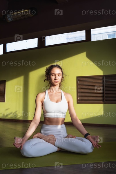 Молодая спортивная женщина, практикующая йогу, занимающаяся медитацией с закрытыми глазами, сидящая в позе лотоса с джняна мудрой на коврике, тренирующаяся в белой спортивной одежде в комнате у стены