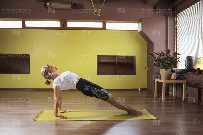 Женщина, практикующая йогу, выполняет упражнение пурвоттанасана, стоит на коврике в студии, поза перевернутой доски