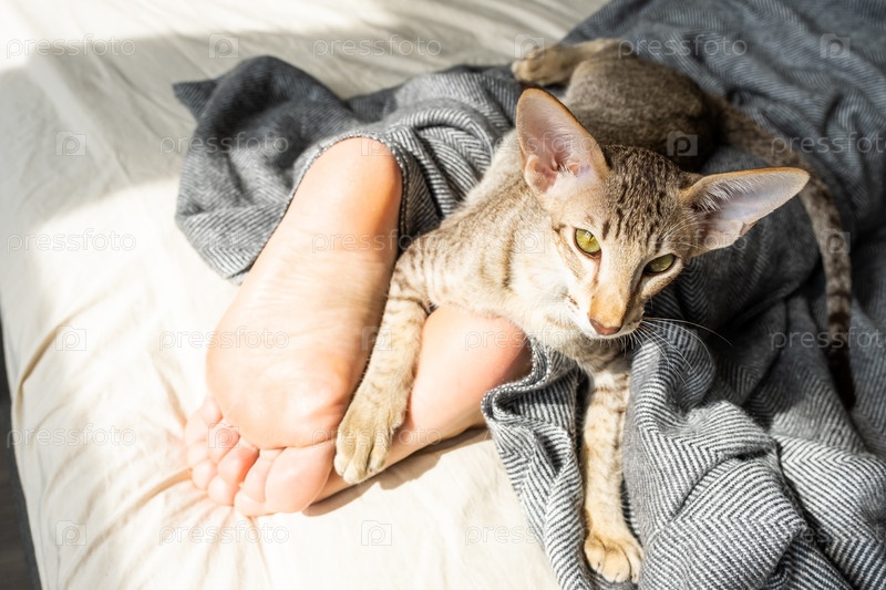 Ориентальный короткошерстный полосатый котенок спит на кровати рядом с ногами женщины