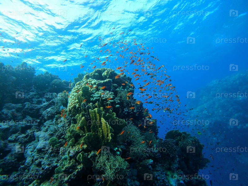 Колония красочных кораллов и мелких экзотических рыб на дне Красного моря в Египте, концепция путешествия