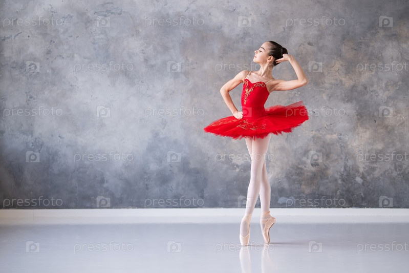 Милая маленькая девочка мечтает стать профессиональной балериной. В зале танцует девушка в ярко-красной пачке на пуантах. Ученик профессионального училища