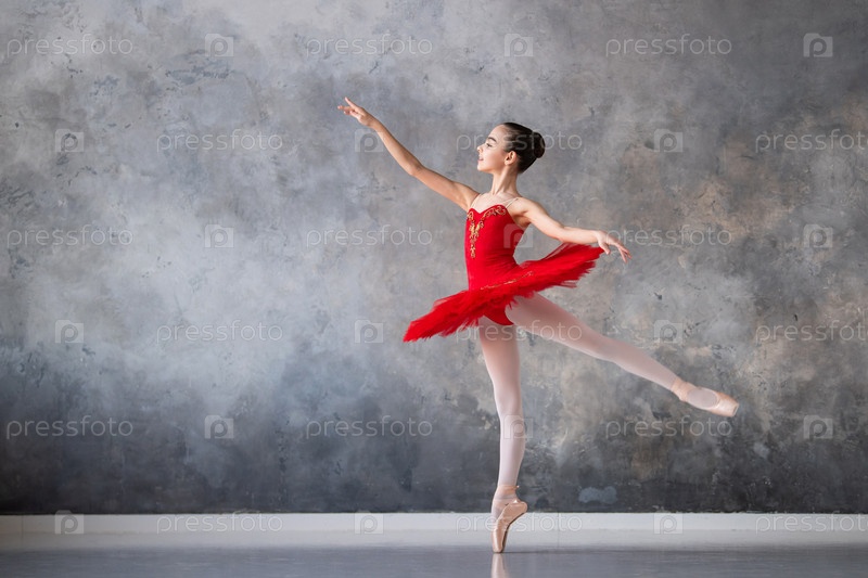 Милая маленькая девочка мечтает стать профессиональной балериной. В зале танцует девушка в ярко-красной пачке на пуантах. Ученик профессионального училища