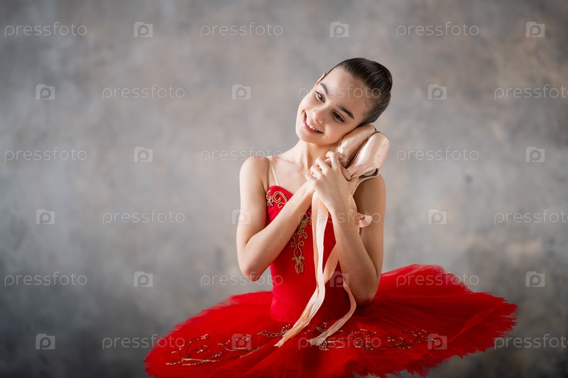 Милая маленькая девочка мечтает стать профессиональной балериной. В зале танцует девушка в ярко-красной пачке на пуантах. Ученик профессионального училища
