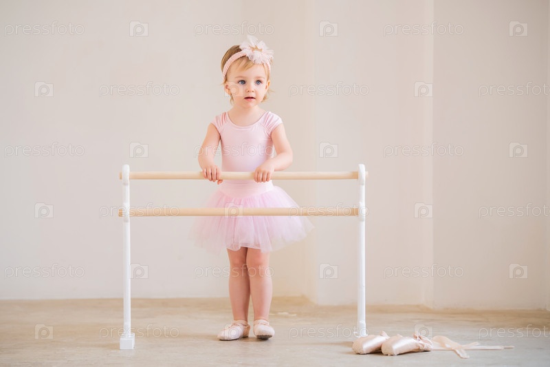Милая голубоглазая балерина в розовом трико и балетной пачке стоит возле балетного станка. Концепция мечты стать балериной