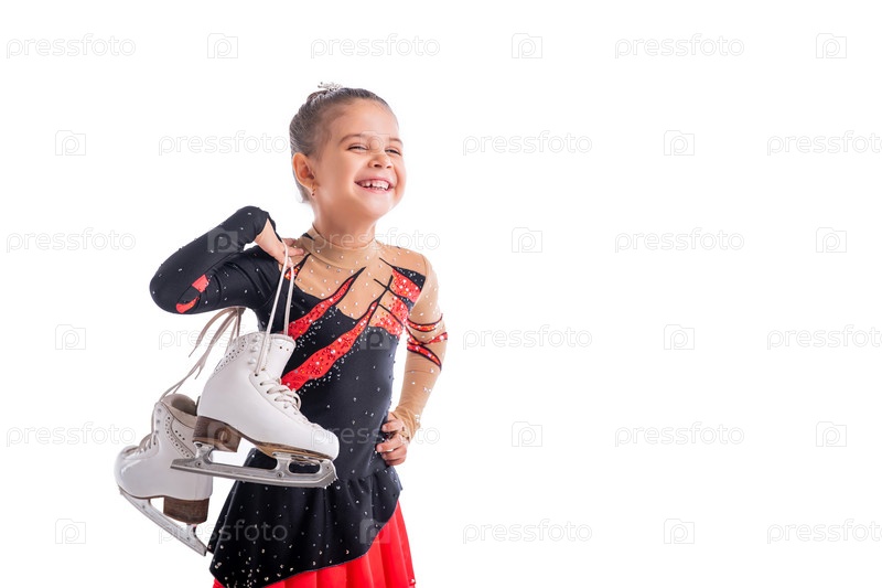 Портрет маленькой смеющейся фигуристки с коньками в руках