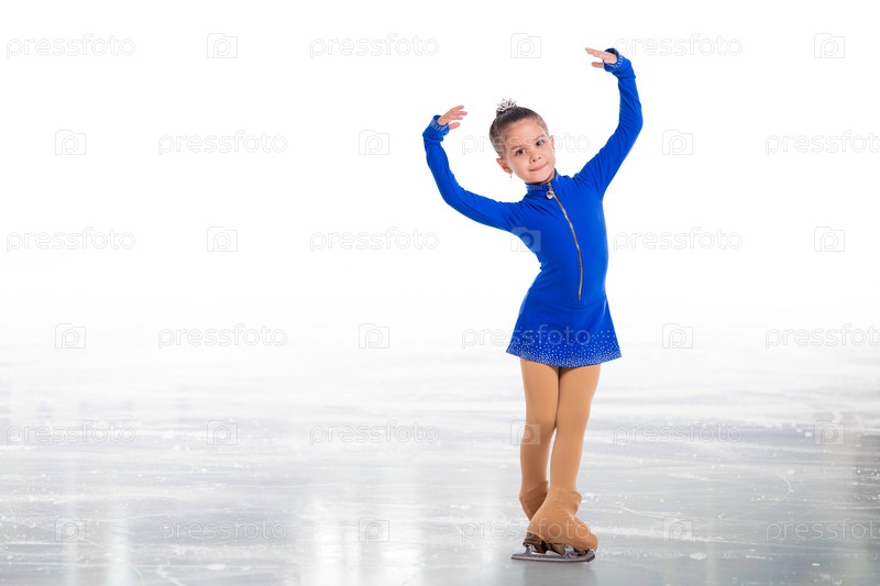 Маленький юный фигурист позирует в синем тренировочном платье на льду на белом фоне
