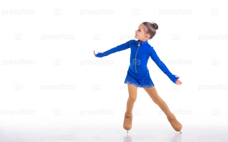Маленький юный фигурист позирует в синем тренировочном платье на льду на белом фоне