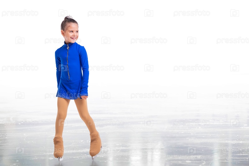 Маленький молодой фигурист позирует в синем тренировочном платье на льду на белом фоне