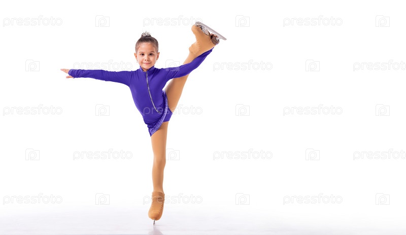 Маленький юный фигурист позирует в синем тренировочном платье на льду на белом фоне