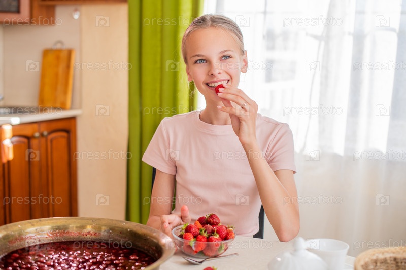 Девушка дома на кухне сидит за столом, ест клубнику, готовит клубничное варенье, улыбается идеальной улыбкой