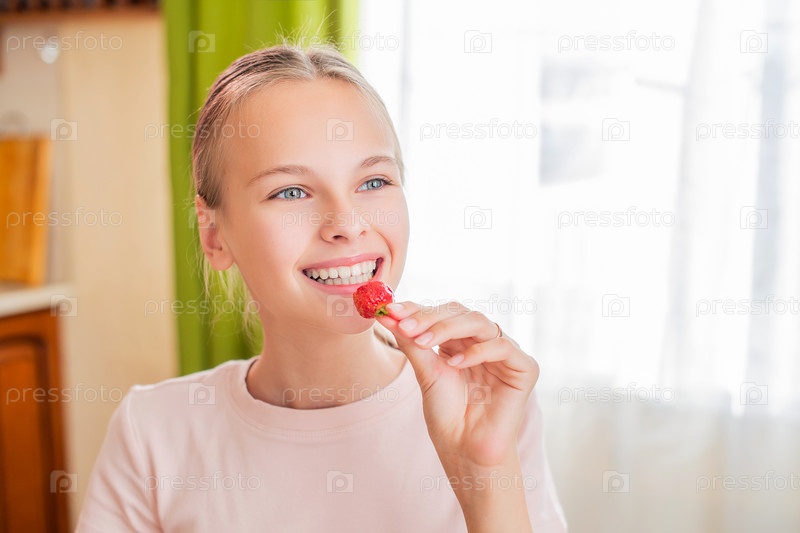 Девочка-подросток ест клубнику дома на кухне, идеальные зубы, очаровательная улыбка, голубые глаза. Портрет крупным планом