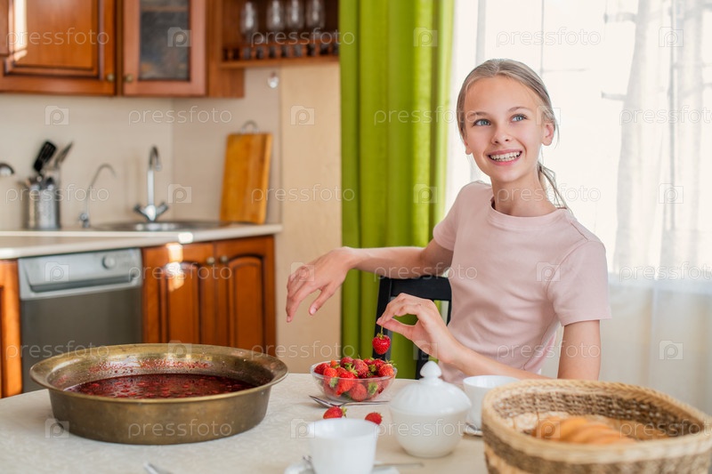Девушка дома на кухне сидит за столом, ест клубнику, готовит клубничное варенье, улыбается идеальной улыбкой