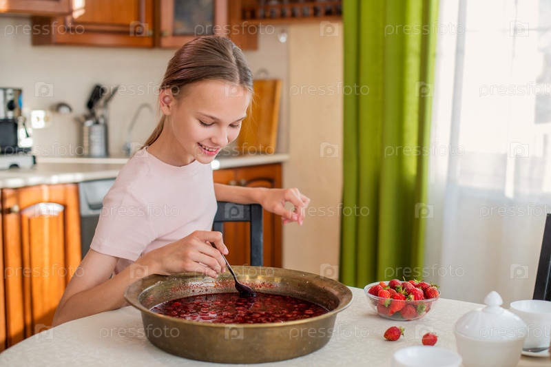 Девушка дома на кухне сидит за столом, ест клубнику, готовит клубничное варенье, улыбается идеальной улыбкой