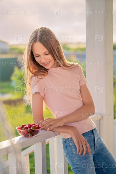 Красивая девушка, блондинка, подросток с длинными волосами летним вечером ест клубнику на веранде коттеджа