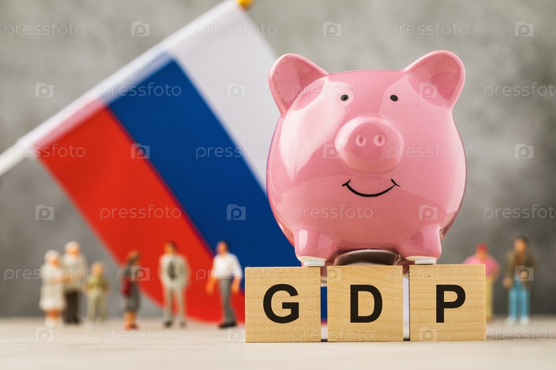 Керамическая копилка, деревянные кубики с текстом и пластиковые игрушечные человечки на фоне флага, концепция на тему ВВП России