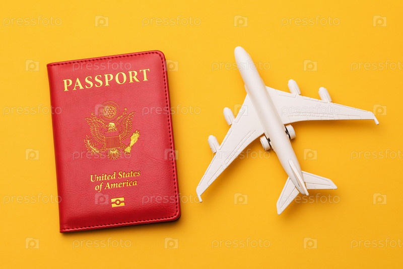 Американский паспорт и игрушечный самолет на цветном желтом фоне, концепция на тему путешествия в Америку