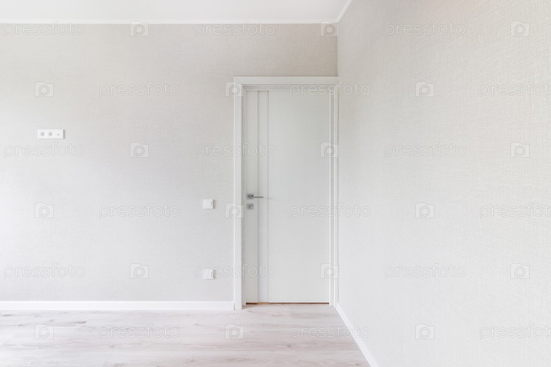 Современная белая дверь. Серая стена со свободным пространством. Минималистичный светлый интерьер